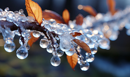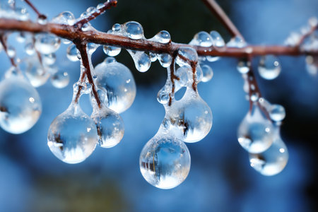 water droplets on a tree branch, frozen in ice, cold in the winter season, close view, dark background of nature