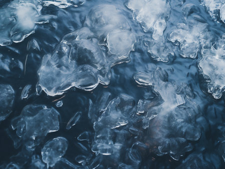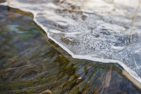 Ice on water texture. Close up of winter frozen water surface.
