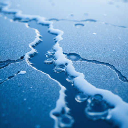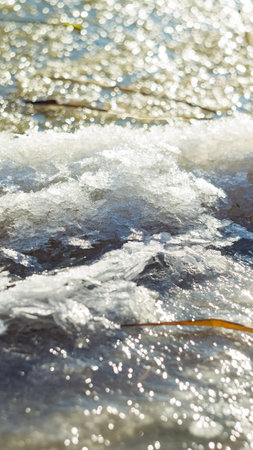 Close-up view of snow covering fractured ice, showcasing winter's serene beauty. Cold, peaceful scene.