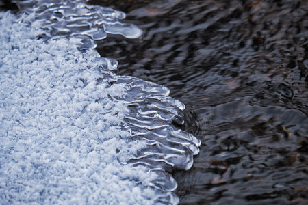 Winter hoarfrost, ice and snow formed over the frozen water surface on the pond in winter. christmas background