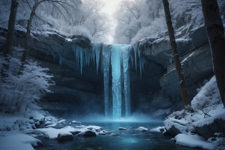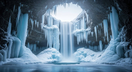 AI Generated. Icy waterfall cascading down frozen cliffs