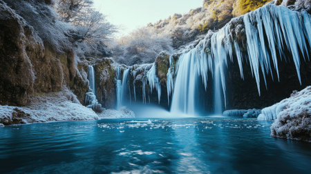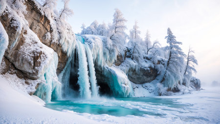 Frozen waterfall cascading into icy blue pool in winter wonderland