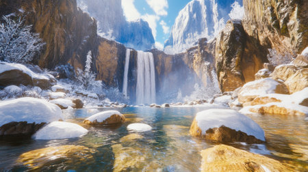 Experience a breathtaking winter scene featuring a majestic waterfall surrounded by snow-covered rocks and a tranquil mountain lake under a bright sky.