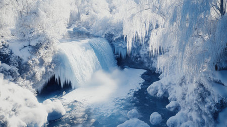 AI Generated. A beautiful waterfall surrounded by ice and snow in nature