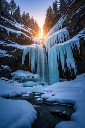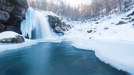 A stunning waterfall, partially frozen, flows down rocky cliffs surrounded by snow and ice, creating a peaceful winter scene in the early morning light.