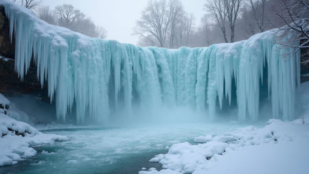 Majestic frozen waterfall with suspended icy cascades and glittering snowflakes