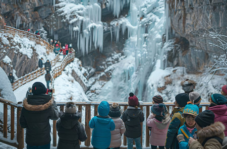 People gathered to witness the majestic frozen waterfall in a winter wonderland, the ice glistening in the sunlight, a breathtaking spectacle of nature.
