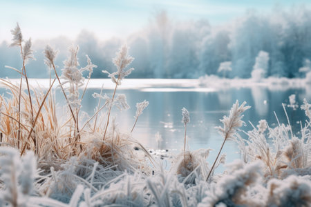 AI Generated. Frosty Reflections on a Shimmering Surface in Winter Landscape