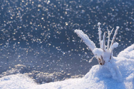 Close up of snow covered plants by the lake