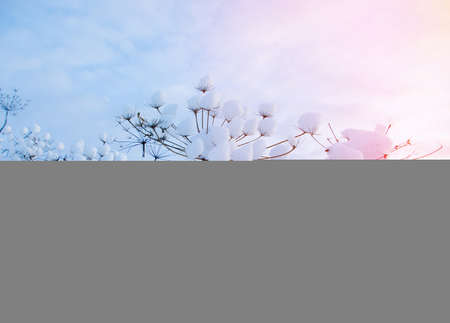 On a cold winter day, the delicate stems of wildflowers are covered with snow and frost. It's cold outside. Background.
