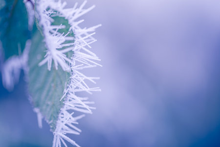 Frosty leaves in winter. Close up of frozen leaf early in the morning in winter, nature macro. Natural colors, seasonal abstract nature hoarfrost