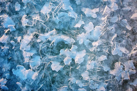 Winter natural background with fragments of blue ice and heaps of pieces of ice floes on Lake on a sunny frosty day. Abstract cold background, mock up. Harsh lifeless environment