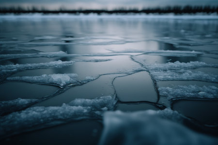 A frozen lake shows distinct cracks in the ice, revealing water beneath. The winter atmosphere is calm, with soft hues reflecting on the ice surface, highlighting the stark beauty of the season.