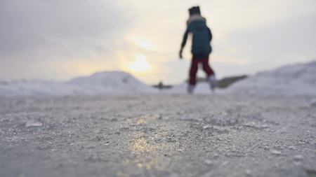 teen girl skating on ice, winter sunset beautiful view, winter holidays