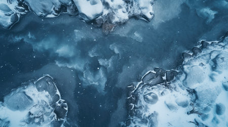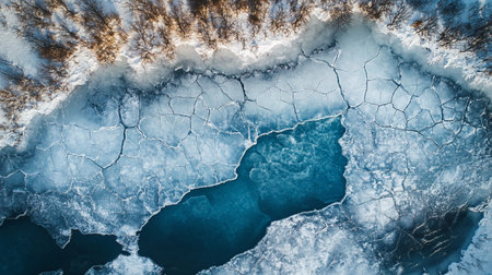 Amazing view of a frozen lake with partially thawed ice, showcasing intricate textures and captivating contrasts in shades of blue and white.