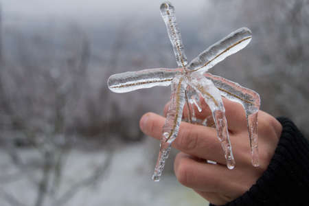 Icy freezing rain winter weather, autumn leaves covered with ice after freezing rain