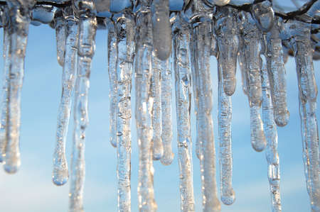 Ice icicles on a branch of a blue Christmas tree, close-up. The concept from now on, change of weather, rain and frost.