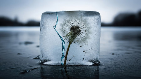 A close-up captures a dandelion flower encased within a clear ice cube. The composition showcases cool tones, with blue and gray hues dominating the scene. The image suggests a natural environment, potentially outdoors, with a focus on conceptual themes of fragility and preservation. Suitable for various creative and illustrative applications.