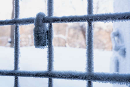 hoarfrost, ice and snow formed over the frozen water surface on the pond in winter in the sunlight. christmas background