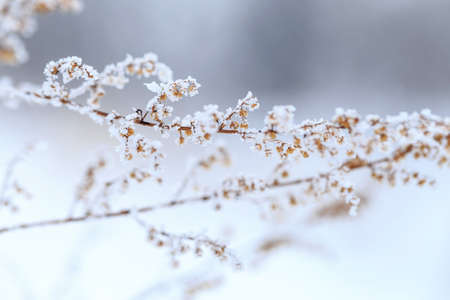 Plants with rime in close up. Beautiful withered frosted plants.