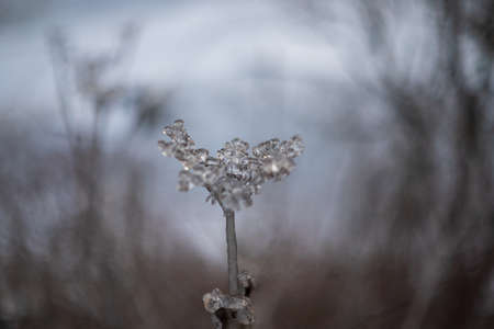 plant covered with ice in winter and blured landscape