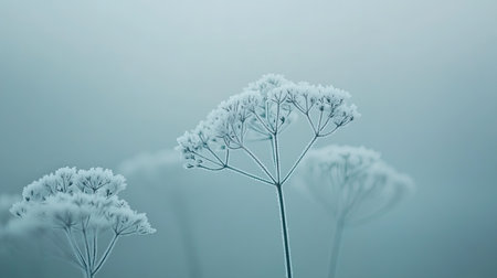 A close up of delicate umbellifer flowers coated in sparkling white frost. The background is a soft focus, cold blue winter landscape, creating a serene and tranquil mood.