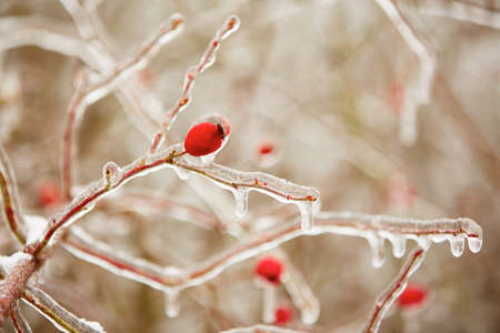 Frozen rosehips covered by icy rain - selective focus