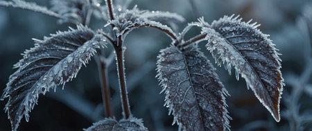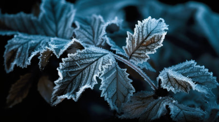 AI Generated. A mesmerizing macro perspective of frozen nature showcasing the delicate beauty of frost covered leaves