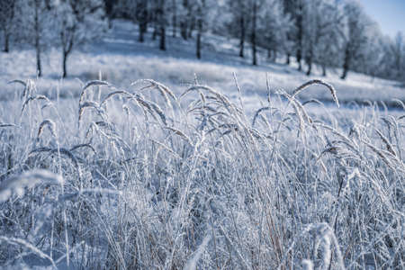 Close-up view of frost-covered plants in a winter field. Serenity and peace.