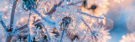 Delicate wildflowers covered in frost glisten in the morning sun. This tranquil winter scene captures the beauty and stillness of nature during a cold season.