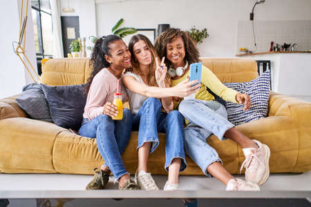 Three happy female friends taking smiling selfie and having fun at home - Funny women using mobile smart phone together celebrating sitting on the living room sofa