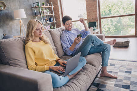 Portrait of handsome beautiful trendy cheerful couple using gadget laptop pastime on divan at home loft industrial interior indoors