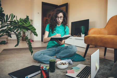 Caucasian girl with curly hair is having online lesson on the floor at laptop while eating cereals and fresh green juice