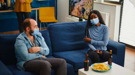 Group of diverse friends meeting in home living room celebating during global pandemic, wearing mask keeping social distance. Multiethnical people taking off protection mask and eating snaks