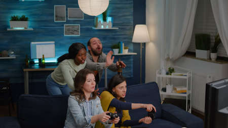 Cherish the moments. Happy multicultured friends singing with microphone while playing karaoke at home, sitting on the couch in the modern apartment
