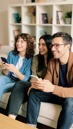 A group of three cheerful friends, one man and two women, relax on a sofa in a modern living room. They are smiling and holding their phones while watching something interesting off-camera.
