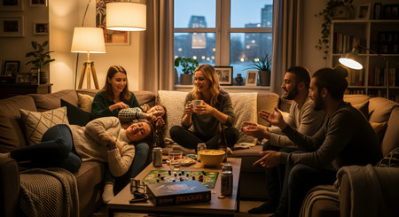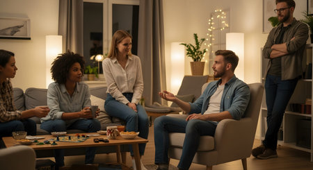 A diverse group of friends gathers in a cozy living room at night, engaged in a lively conversation. Warm lamp lighting creates a relaxed and intimate atmosphere for their social interaction and bonding.