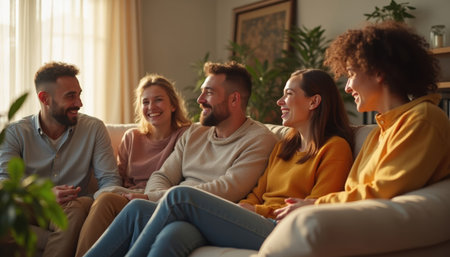 A diverse group of friends sitting on a couch, laughing and enjoying each other's company in a cozy living room.