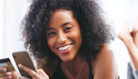 Young couple sitting on a cozy couch shopping online with a smartphone and paying with the credit card. Boyfriend and girlfriend spending money online in the apartment using the cellphone
