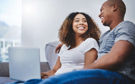 They share so much together. Shot of a young couple using a laptop while relaxing at home.