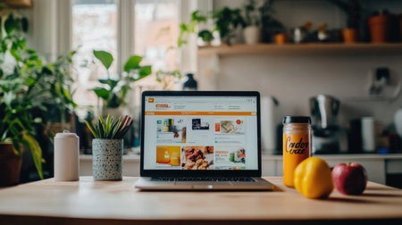 A vibrant workspace featuring a laptop open to a colorful website, with fresh fruits on a wooden table, surrounded by plants, creating an inviting atmosphere.