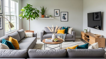 Modern living room with grey sofa, coffee table and plants in pots