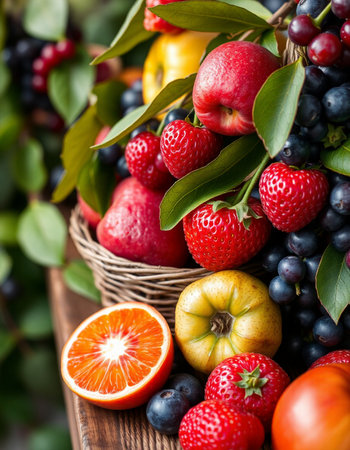 A colorful assortment of fresh fruits, including apples, pears, oranges, grapes, lemons and strawberries, arranged in a rustic basket on a wooden table in a lush garden setting