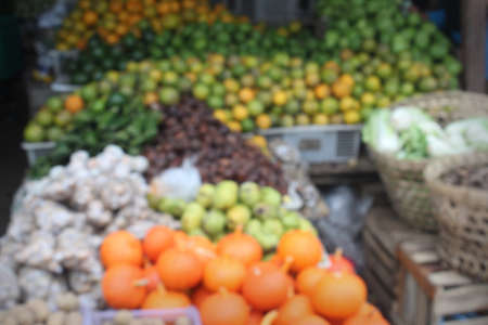 Blurred background of fresh tropical fruit stall in basket in fruit market