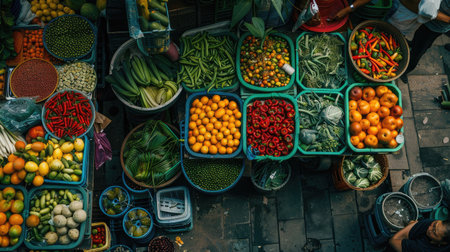 High-angle view of various fresh organic vegetables in woven baskets at a traditional market. Vibrant assortment of seasonal produce representing local food culture and healthy nutrition