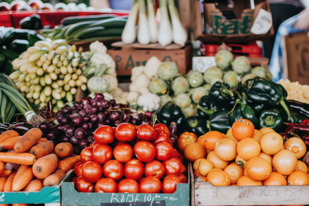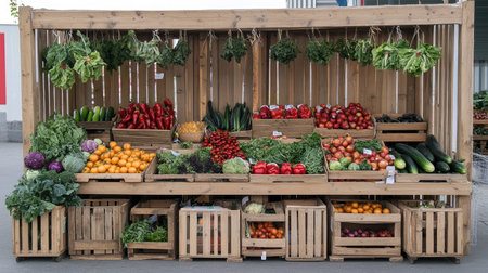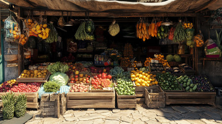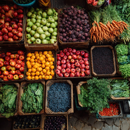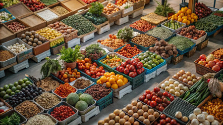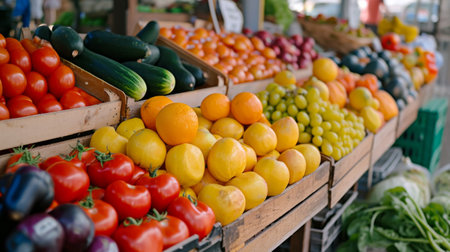 A bustling market offers a colorful array of fruits and vegetables, showcasing fresh harvests for shoppers.