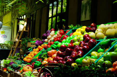 Fruit market with various colorful fresh fruits and vegetables - Market series