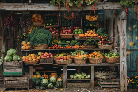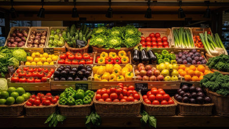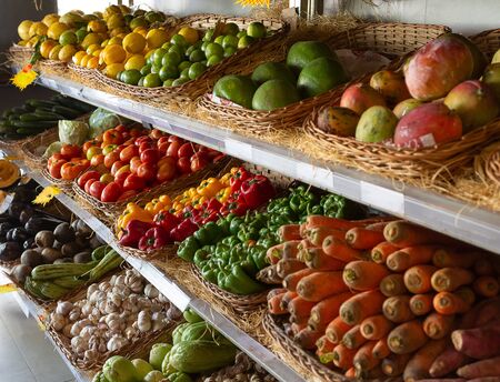 Various fruits vegetables are arranged in baskets, of autumn harvest season at local market