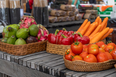 Fresh fruits and vegetables in a basket on a wooden table in the market