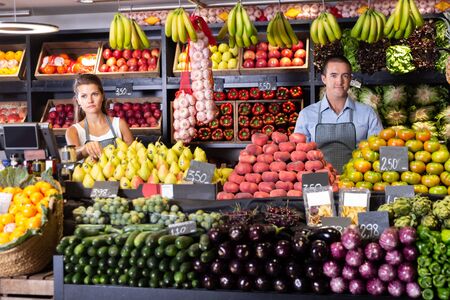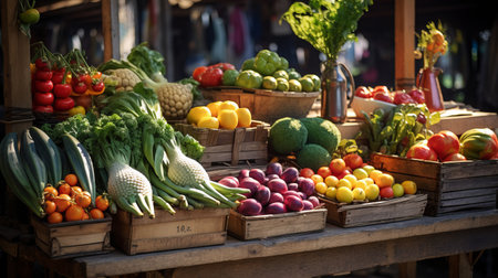 Fruits and vegetables at a farmers market. Market stall with variety of organic vegetable
